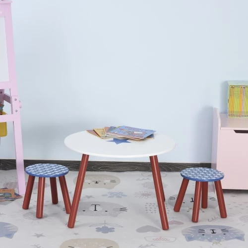 – Table ronde, tabourets ronds motif étoilé bicolore bleu et blanc idéal pour ajouter une touche déco supplémentaire à votre intérieur