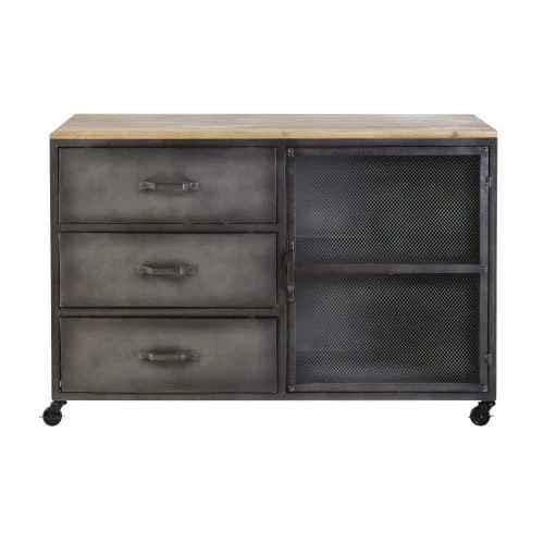 Votre ado va adorer le look indus du cabinet de rangement 3 tiroirs 1 porte en métal et sapin REBEL ! Très tendance grâce à l’alliance de son bois à l’effet vieilli et de son métal gris patiné, ce meuble de rangement a tout pour plaire. Outre son design très esthétique, ce cabinet ne manque pas de rangements ! Muni de 3 tiroirs et d’une porte grillagée qui dissimule un espace de rangement supplémentaire, votre ado pourra y ranger ses vêtements mais aussi ses objets fétiches, figurines et autres accessoires. Son petit plus ? Ses roulettes qui en font un cabinet de rangement nomade ultra pratique !
