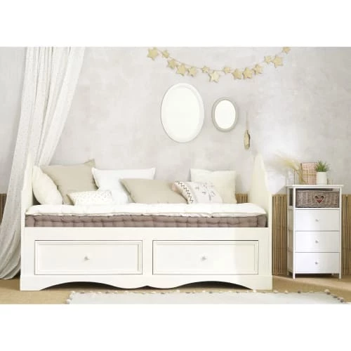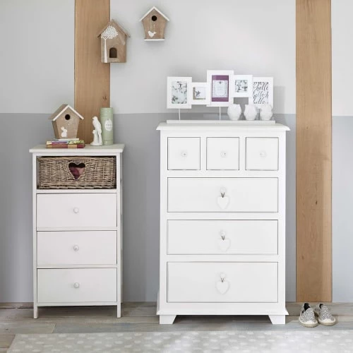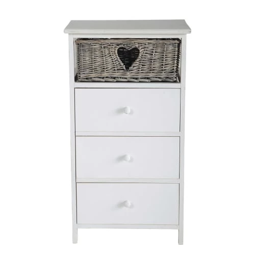 Tout en simplicité, ce chiffonnier 3 tiroirs en paulownia et 1 panier en osier GABRIELLE complètera votre déco de chambre romantique. Composé de 3 tiroirs et d’un petit panier, ce chiffonnier blanc vous offrira des rangements complémentaires. Le détail déco : le panier en osier avec le cœur. Notre conseil : décorez son plateau avec l’objet déco de votre choix.