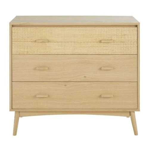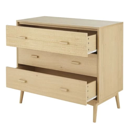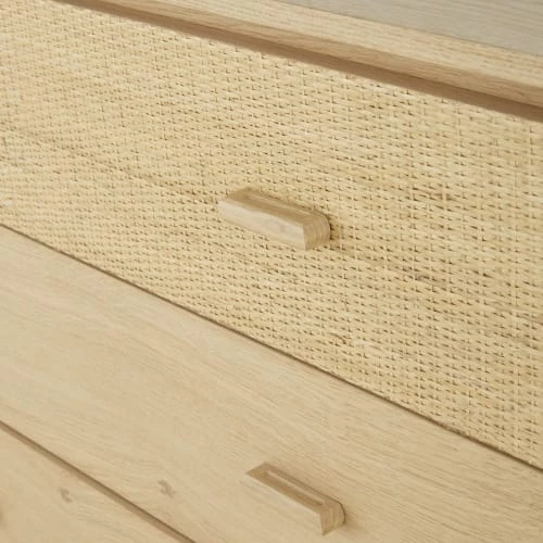 Façade tiroir du haut : aggloméré, placage chêne et revêtement en rotin tressé